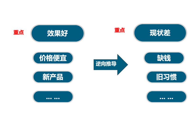 如(rú)果産品效果好,我們就(jiù)推導實際現狀很差的人(rén),價格便宜,我們就(jiù)推導有錢;如(rú)果是新産品,我們就(jiù)推導用戶的舊習慣,畢竟有矛盾才會有好戲。